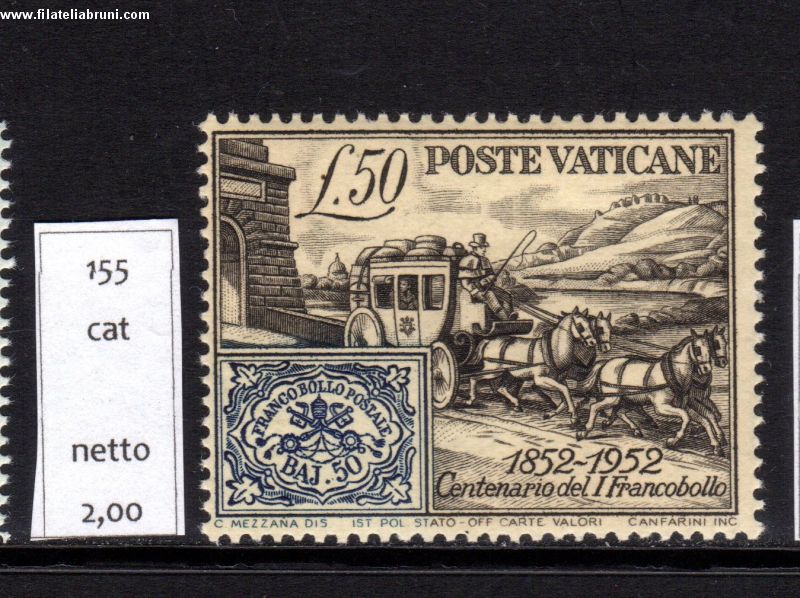 1952 Vaticano Vatikanstaat centenario primo francobollo dello Stato Pontificio nuovo gomma integra mnh catalogo Sassone nr 155 catalogo Michel nr 188a