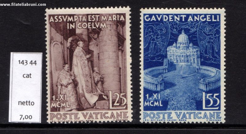1950 Vaticano Vatikaanstaat Dogma dell'Assunzione Dogmas von der leiblichen Aufnahme Marias in den Himmel nuovo gomma integra mnh catalogo Sassone nr 143 144 S.33 catalogo Michel nr 178 179