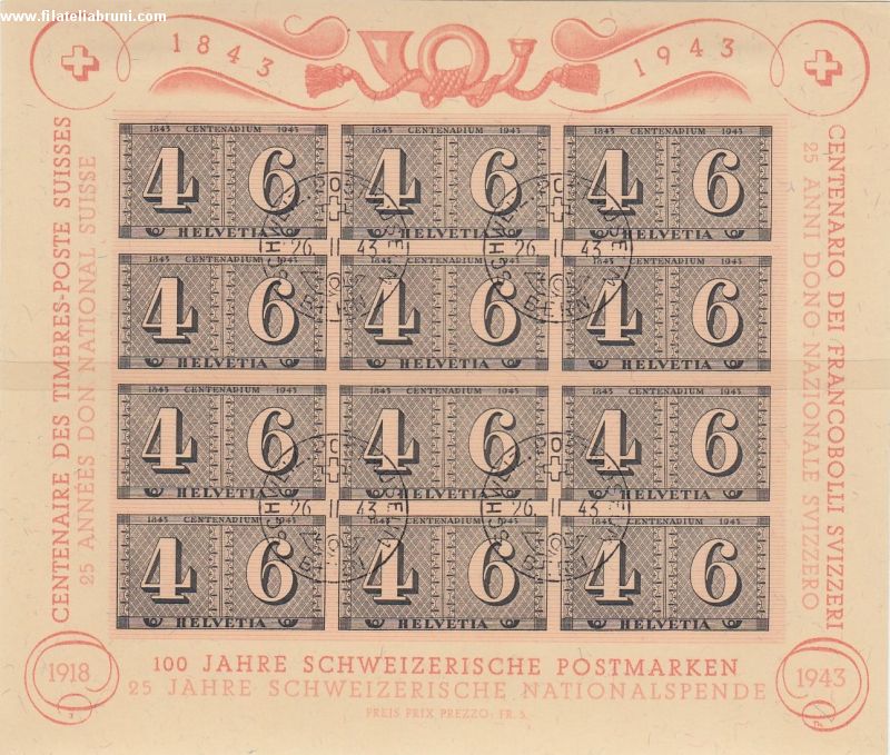 1943 Svizzera Schweiz Helvetia centenario dei primi francobolli svizzeri usati used catalogo Unificato nr bf 8