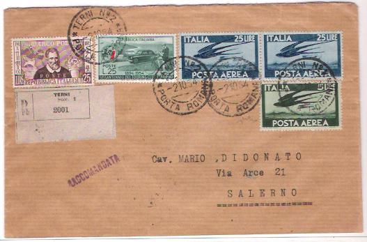 Lettera Raccomandata da Terni per Salerno, affrancata con valori gemelli 25 lire Marco Polo, 25 lire touring, coppia 25 lre posta aerea, 5 lire posta aerea verde