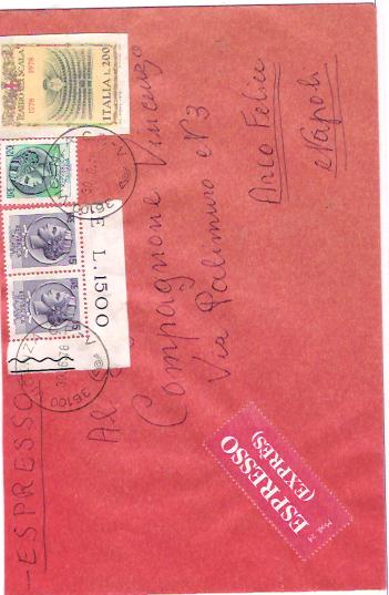 Lettera espresso da Vicenza per Napoli affrancata con coppia 15 lire ed 1 valore della Siracusana da lire 120 ed un francobollo da 200 lire del bolletino postale del teatro della Scala . Timbro d'arrivo