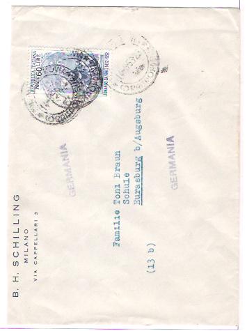 Lettera affrancata con lire 60 Leonardo da Vinci da Milano per Augsburg Germania spedita in data 14/08/53